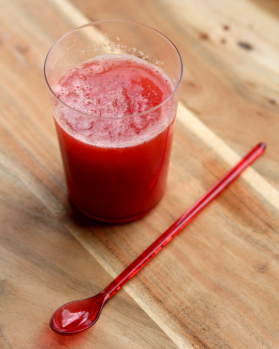 2. Tomatensap. Ja, slechts één ingrediënt, maar als je eenmaal zelfgemaakte tomatensap hebt geproefd, wil je nooit meer uit een pak. Vaak maken we een combinatie van verschillende tomaatjes, maar cherrytomaten doen het vooral erg goed, door de zoetheid. Daarna nog afmaken met wat worcestershiresaus, tabasco en zout (en eventueel een scheut wodka voor een Bloody Mary).