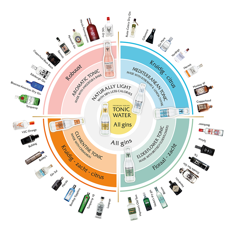 Tonicmerk Fever-Tree heeft namelijk inmiddels 7 soorten tonic uitgebracht. En die gaan allemaal op hun beurt weer perfect samen met bepaalde gins. Ze hebben daarom een smakenwiel ontwikkeld zodat je altijd een perfecte match kan maken tussen tonic en gin. Je vindt het wiel hieronder. Klik hier voor een vergroting in een nieuw tabblad.