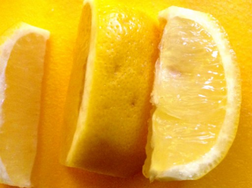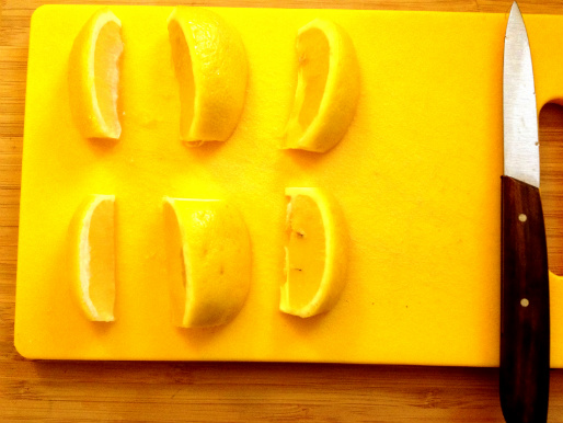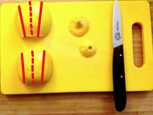 Begin bij het begin en leg een vochtig doekje op je aanrecht (anti-slip, check!) met daarop je snijplank. Zorg daarnaast dat je een goed, scherp mesje met glad snijvlak hebt. Leg vervolgens je citroenen en/of limoenen klaar en snijd de kontjes er van af. Halveer de vruchten door de lengte, zoals op bovenstaande foto laten zien.