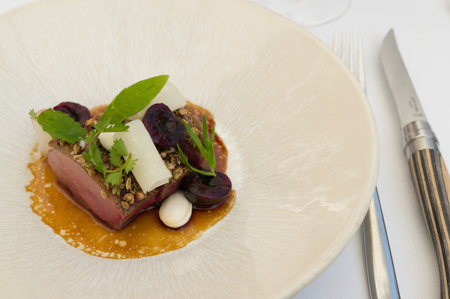De eend verdween weer terug naar de keuken en even laten kregen we een bordje met daarop een mooi, stevig stukje van de eendenborst inclusief de kruidenkorst. Daarbij kersen, verse onrijpe amandelen, ingemaakte koolrabi en een jus van eend en gebruinde boter.