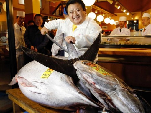 Hoewel vorig jaar een bijna 270 kilo wegende Bluefin tonijn voor “slechts” €561,070 verkocht werd op de openingsdag, ging dit jaar eigenaar van de Sushi Zanmai keten Kiyoshi Kimura een stapje verder en verbrak zijn eigen record met een ruim 220 kilo wegende vis.