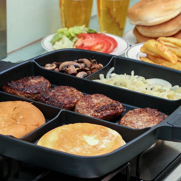 De MasterPan All-In One Frying Pan werkt bijna als een soort gourmetstel, maar dan op je fornuis. In de vijf compartimenten kun je afzonderlijk dingen bakken.