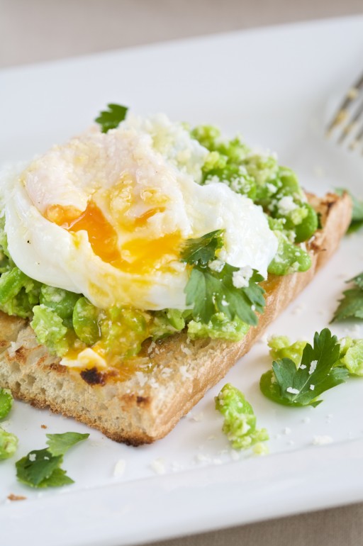 Zuurdesembrood met tuinbonen, gepocheerde eitjes en Parmezaan