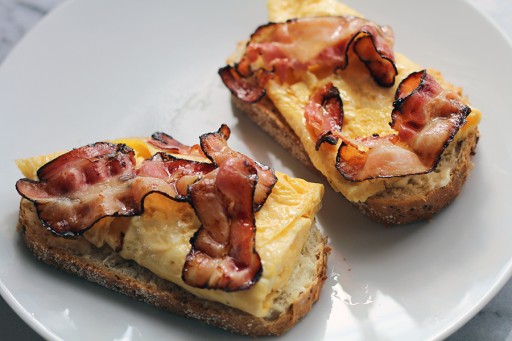 Het gebeurt regelmatig dat wij de zondagmiddag beginnen met een luchtige baveuse omelet, dus waarom niet tijdens Pasen? Serveer de omelet op stukjes brood met een stukje krokant gebakken bacon. Mmm…!
