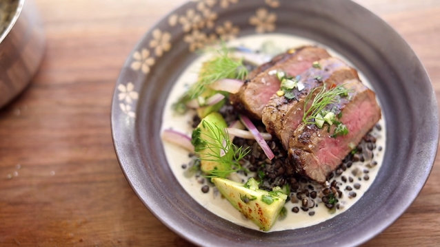 Veel ingrediënten heb je voor dit gerecht niet nodig. Het draait allemaal om een perfecte steak, heerlijke beluga-linzen en een aantal smaakmakers, zoals rode ui, venkel, knoflook, peterselie, koriander, avocado en chili flakes.