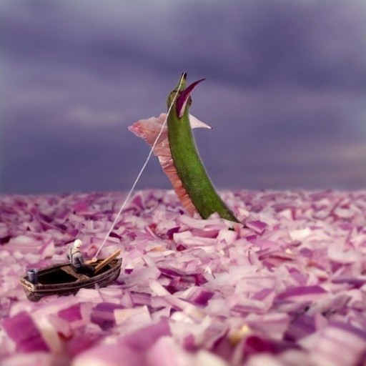 Zo zien we een gondelbootje onder een boog van watermeloen door varen, of een voetbalwedstrijd met cranberry’s als bal onder een bananendoel, of een boot in een zee van rode ui.