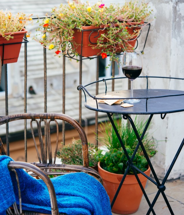– Inklaptafel is het sleutelwoord. Ideaal voor kleinere ruimtes, en als je goed zoekt vind je soms de mooiste exemplaren. Wij vinden de variant die je aan de muur of balkonrailing monteert het fijnst, omdat je ‘m dan alleen omhoog hoeft te klappen. Uiteraard zijn de Franse, metalen tafeltjes ook onweerstaanbaar leuk.