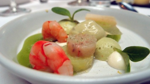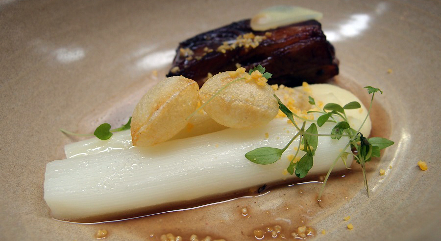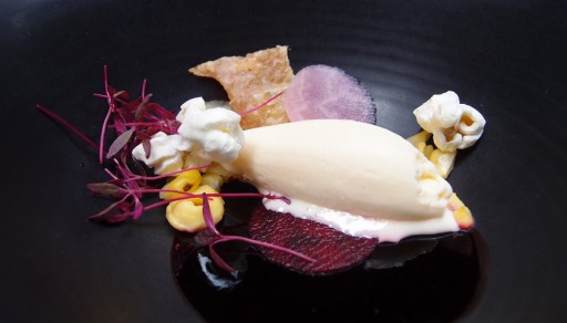 Onze hersenen zijn inmiddels volgestopt met informatie over de restaurants, de gids, de kandidaten voor 2014 en allerlei interessante websites die we kunnen bezoeken (we sommen ze straks even voor je op). Nu is het de hoogste tijd ook onze maag te vullen. We starten met een zoet gerechtje. Beetje ongewoon misschien, maar het is verrassend lekker. Het gerechtje bestaat uit allerlei componenten. We ontdekken popcorn, biet – niet alleen de partjes maar ook de gelei – en (heel verrassend) een stukje lekker knapperig kippenhuid. Kom maar op met gerechtje twee!