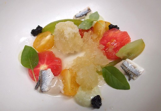 Ook het tweede gerechtje kent veel ingrediënten. We proeven tomaat, basilicum en – je ziet het al op de foto – sardine. Het hoofdbestanddeel van de derde dish is komkommer. En die mixt goed met de gamba’s die het bord opleuken. Gerecht nummer vier is een Niven-klassieker: spaghetti van snijbonen met kleine korreltjes uitgebakken spek en parmezaan. Niet te zien, maar wel aanwezig onder dit groene baaltje, een gepocheerd kwarteleitje. Een lekkere miniverrassing.