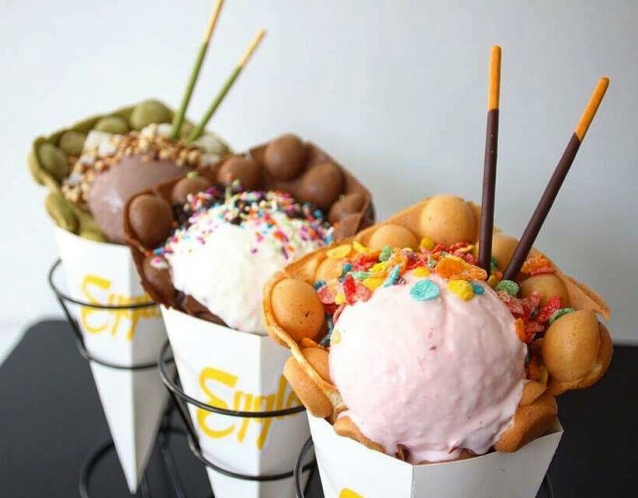 Vergeet de Luikse wafel: Eggloo in New York serveert wafels met allemaal kleine bolletjes, in een puntzak, met daarbovenop ijs, kleurrijke strooisels, vers fruit, nootjes en nog veel meer lekkers.