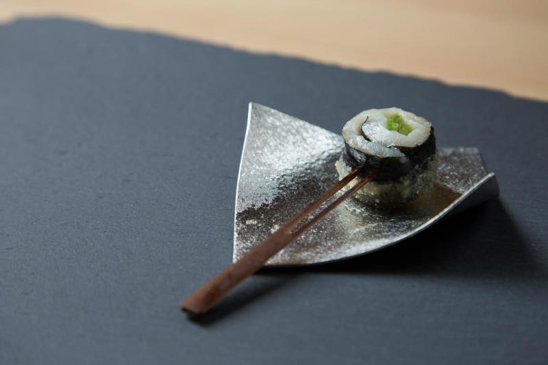 Wat kun je hier dan zoal eten? Gefrituurde zwarte kabeljauw met peterselie bijvoorbeeld, opgerold als een traditioneel sushi-rolletje, maar dan op een stokje. Maar ook uni (zee-egel) met zeewier, zalm met Japanse pickles, en gefrituurd kwartelei met truffel en truffel-olie. Dat klinkt ook behoorlijk Japans en tóch laat de chef ook zijn Spaanse invloeden gelden.