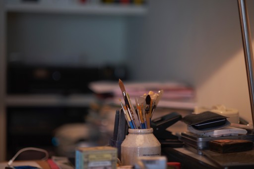 Mijn werktafel, ik heb veel geverfd voor dit boek.