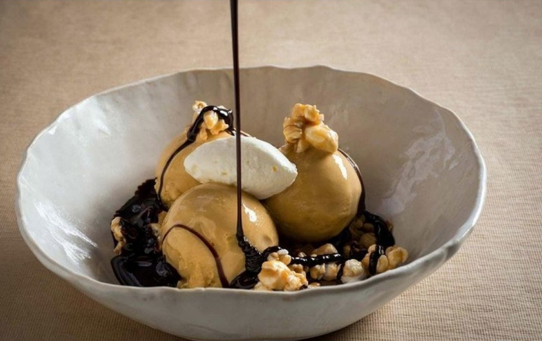 Salted caramel sundae bij ABC Kitchen met popcorn, pinda’s, ijs, chocoladesaus en slagroom