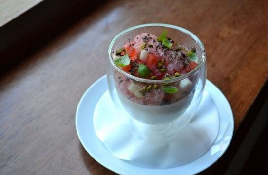 Panna cotta met vanilleroom, watermeloen granita en Siciliaanse pistachenootjes