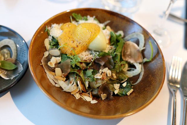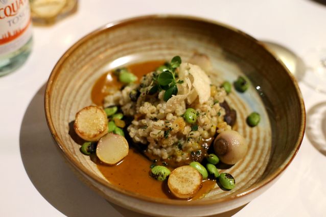 Hoofdgerecht nummer één: een grote gebakken portobello, met parelgort, meiknolletjes, rozijnen, geblakerde sojaboontjes (gouden vondst!) en worteljus. Een heel fijn gerecht, al had de parelgort wat ons betreft wat spannender (lees: kruidiger) gekund.