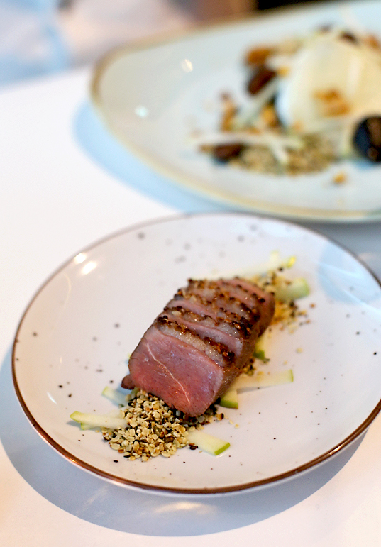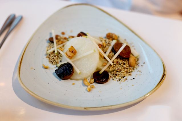 Tafelgenoot bestelt de koolrabi met maanzaad en hennepzaadjes, geserveerd met Granny Smith-appel en mascarpone.