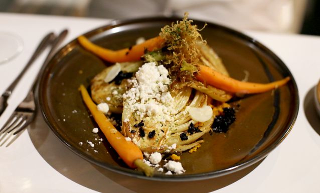 De gekarameliseerde venkel in beurre noisette is ook een piekfijn vegetarisch hoofdgerecht. Door de gember, munt en knoflook wordt het allesbehalve saai, en de karamel van zwarte olijven vinden we een slimme toevoeging.