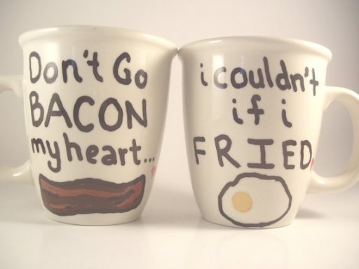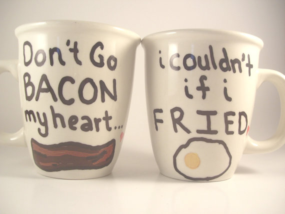 Omdat het liedje van Elton John en Kiki Dee zo leuk is en je gewoon van ei met bacon houdt. Set Etsy, €7,40 (plus €15,69 verzendkosten)
