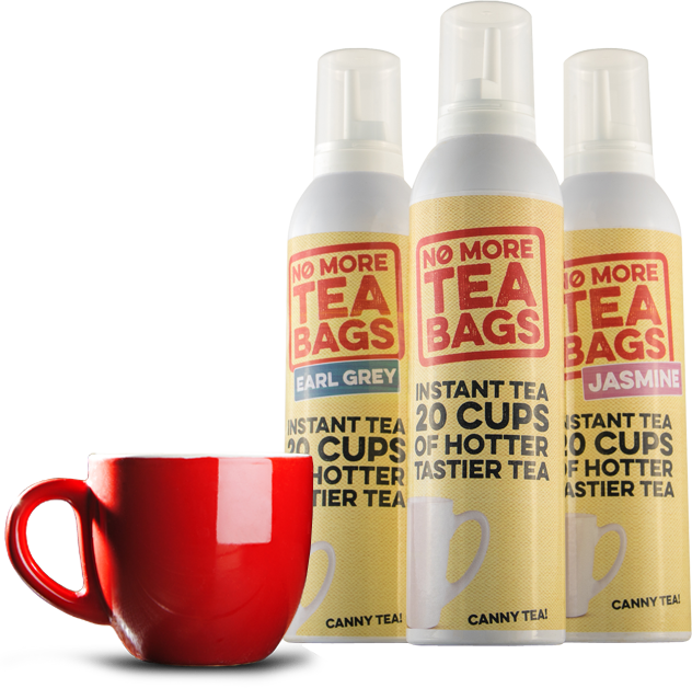 Het product heet No More Tea Bags en zit in een spraybus. Je sprayt een beetje in je mok, doet er heet water bij en voilà… je thee is klaar. Mocht je helemaal een luie donder zijn, dan kun je het ook direct in je mond sprayen (iew!).