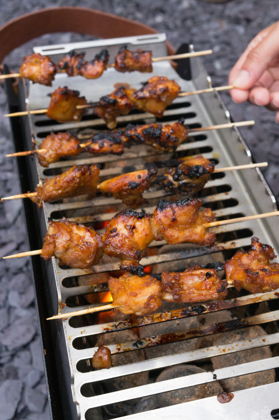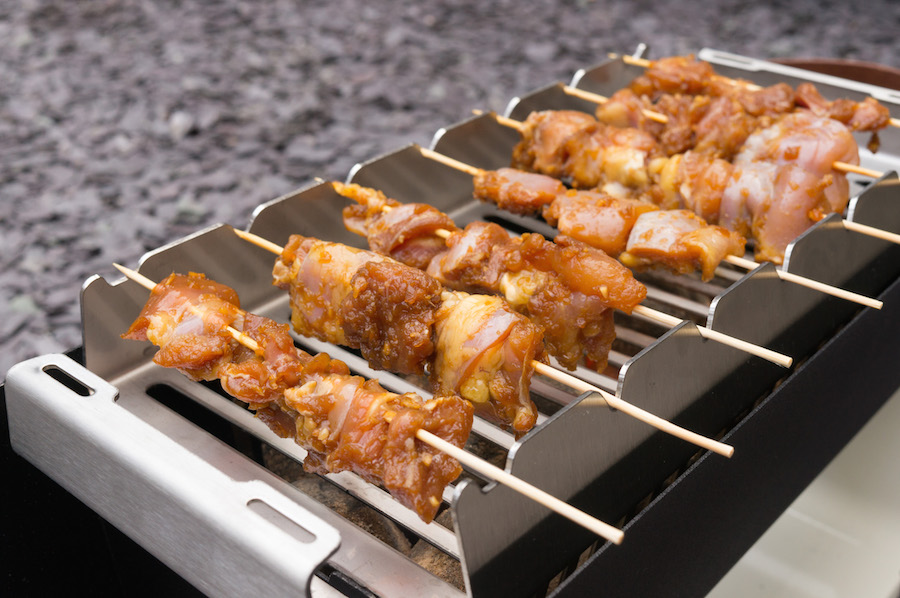 We beginnen met het grillen van saté. Daarvoor gebruiken we de kant met de inkepingen, waar de satéstokjes perfect inpassen. De saté komt eruit te zien zoals je wilt dat saté van de grill eruitziet: heerlijk geroosterd. Je kunt de stokjes makkelijk draaien tijdens het grillen.