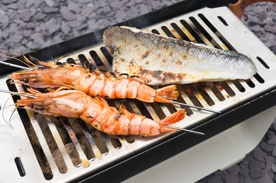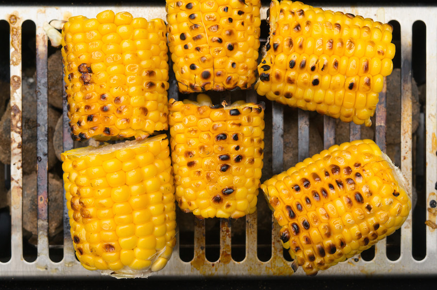 Daarna testen we de platte grillkant. Daarop gaan grote gamba’s aan een spies, een stukje zeebaars en maïskolven. De garnalen en zeebaars zijn zó klaar (en de vis blijft bovendien niet plakken, mede dankzij deze tips) en hebben die authentieke barbecuesmaak.