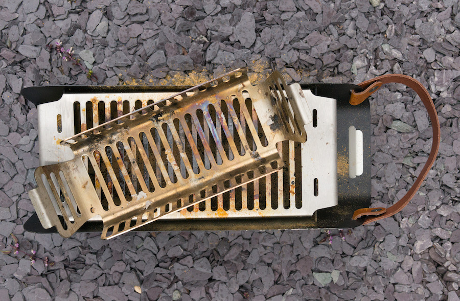 De UNA grill blijft daarna nog een flinke tijd heet. Maar als de briketten eenmaal zijn opgebrand, is ‘ie redelijk snel afgekoeld. Je haalt de roosters eruit, daarna kun je de aslade uitkloppen boven een prullenbak.