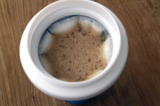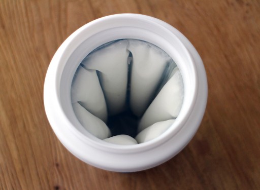 De volgende dag is het element absoluut koud genoeg. Helaas past -ie niet meteen goed terug in de beker. Logisch, want het element is een beetje uit zโn vorm gegaan. Even flink in de beker duwen. Conclusie: vries het element echt met de beker eromheen in.ย Ook de twee ringen die je aan de beker moet draaien, zijn een beetje scheef, waardoor het niet helemaal goed aan te draaien is. Je merkt nu de lage prijs; de kwaliteit van de materialen is niet helemaal top.