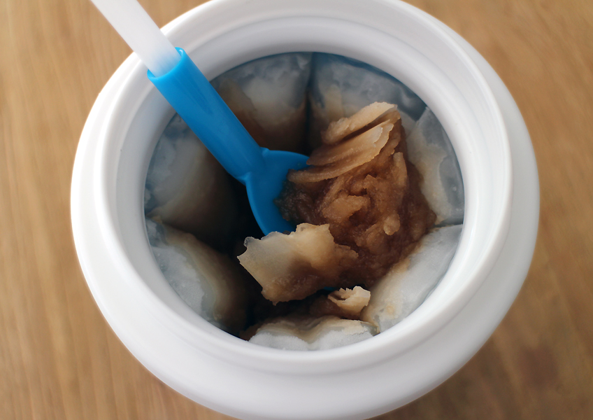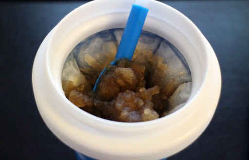Wij gingen aan de slag met cola; een klassieke slush-smaak. De drank die je in de beker giet, moet (koelkast)koud zijn. Heel diep is de beker niet; wij deden er een half glas cola in. Na 30 seconden in de flexibele beker te hebben geknepen, vormen zich de ijskristallen. Allereerst lijkt dit meer op ijsschaafsel met colakleur dan echt een slush, maar als je even door gaat met knijpen en een paar keer met de speciale lepel roert, heb je al gauw een mooie slush. Hij doet precies wat -ie belooft. De slush is lekker, precies zoals vroeger!