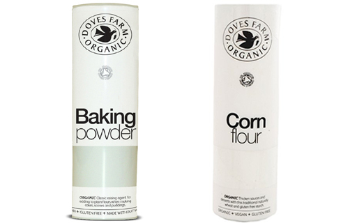 Het merk Doves Farm verpakt hun maïzena, bakpoeder en andere bakproducten in strakke witte busjes. Onder andere te koop via deze website.