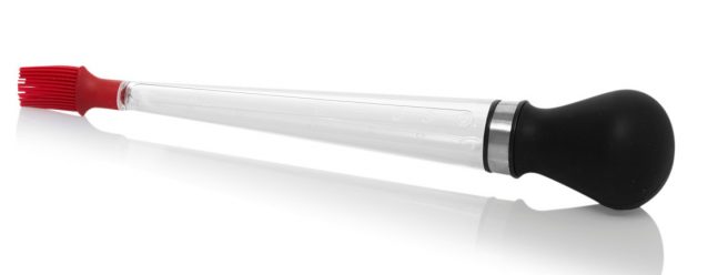 Hiermee zuig je het vet uit de schaal op, die je vervolgens weer over de kip kan gieten. De vleesbedruiper van Cuisipro is ideaal; deze heeft een pipet en zowel een sproeikopje als een siliconen kwast. Je kunt zelf deze opzetstukjes afwisselen. Te koop bij o.a. De Bijenkorf en Cook&Co.