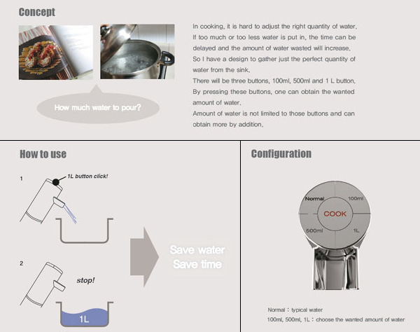 De ‘Cook Faucet’, ontworpen door Jae il Bae, geeft water in afgemeten hoeveelheden, zoals 100 of 500 ml. Ideaal voor in recepten, je pastapan, waterkoker, et cetera. Verspillen is zonde!