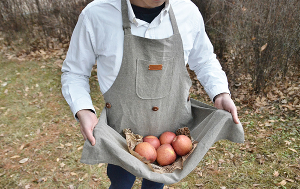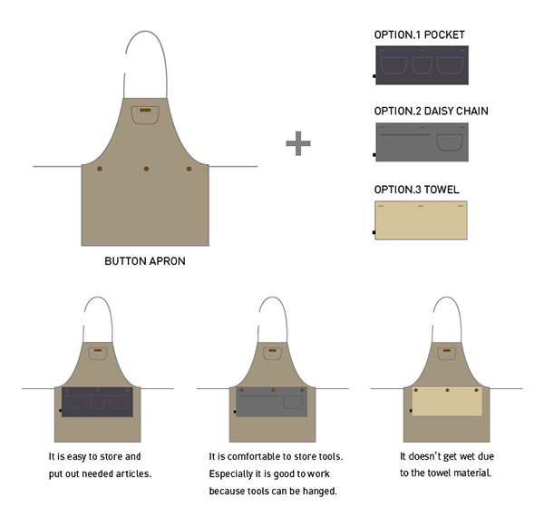 Met de knopen zet je één van de stoffen onderdelen aan het basisschort vast, waarbij je kunt kiezen uit drie soorten. Zo is er een ‘opzetstuk’ met drie zakjes, een met lusjes en een zakje, en kan je tot slot kiezen voor een variant die waterafstotend is.