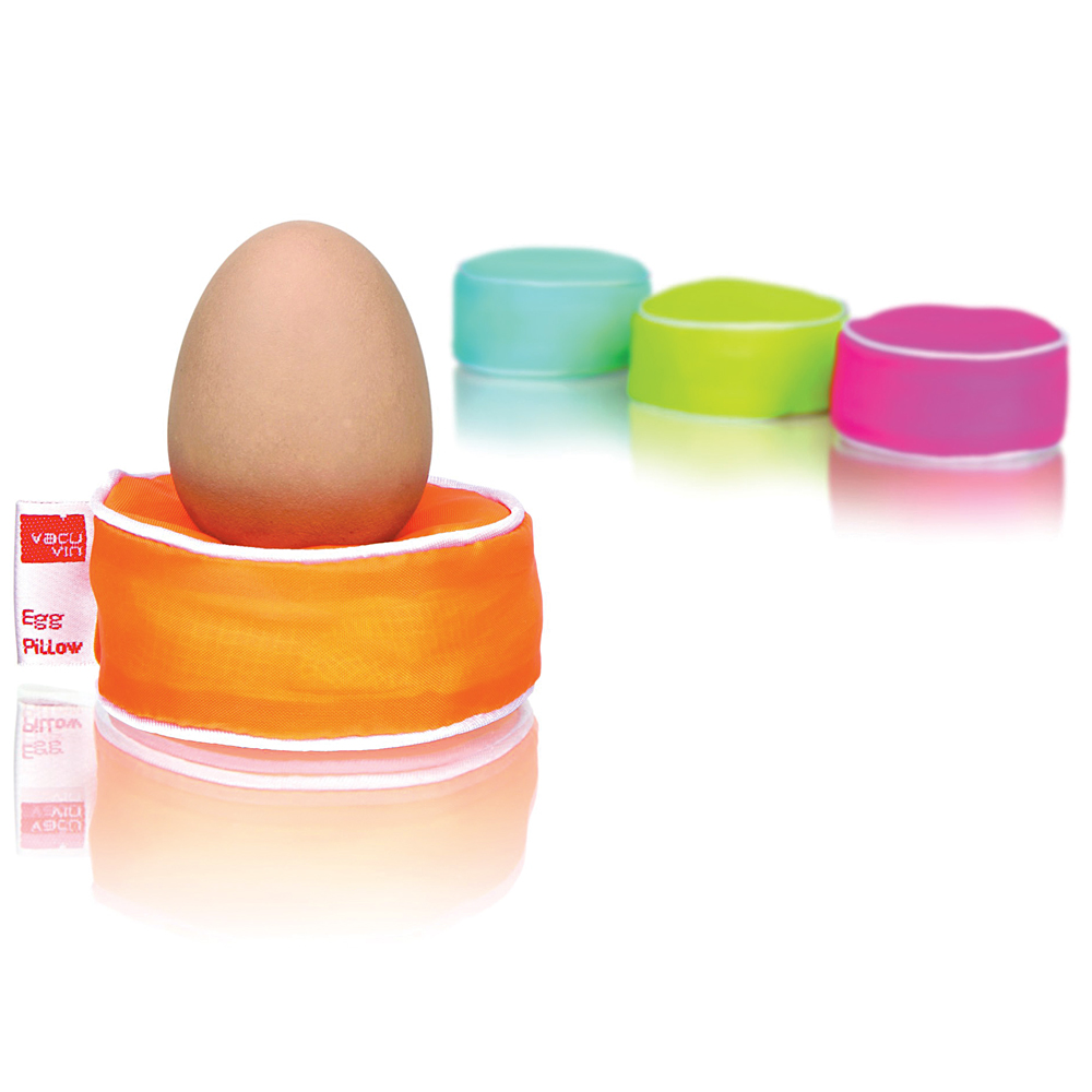 Grappig idee van VacuVin: in plaats van een eierdopje, laat je je gekookte eitje prinsheerlijk zitten op zโn eigen kussen. De Egg Pillow kost 7,95 per stuk, is er in meerdere kleurtjes en kunnen in deย wasmachine. Onder andere hier te koop.