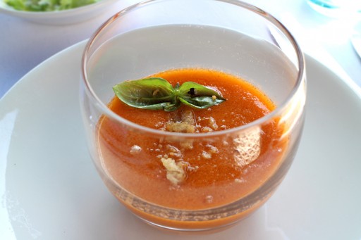 Koude geroosterde tomatensoepje met basilicum en olijfolie