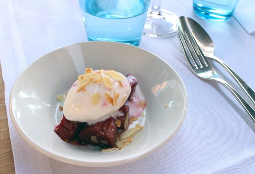 Roomijs van geitenmelk met rabarber en amandelschaafsel
