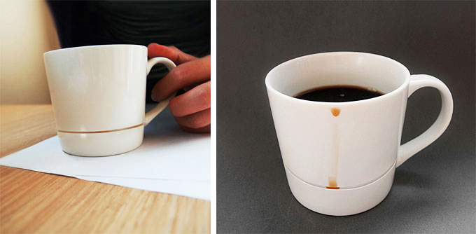 Je kent het vast wel: drink je nét lekker een slok van je kop koffie, vallen er druppels op je hagelwitte papieren of brandschone toetsenbord. Irritant! Vanaf nu is daar een geniale oplossing voor. Designer Kim Keun Ae bedacht namelijk de ‘The Drop Rest Mug’: een superslimme koffiemok met een strategisch geplaatst gleufje die het lekken van koffie onmogelijk maakt.