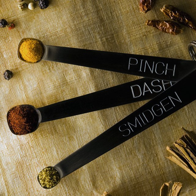Op de lepeltjes staan de woorden smidgen (op de kleinste), pinch (op de middelste) en dash (op de grootste). Weet je precies welke je nodig hebt, de volgende keer dat Jamie of Nigella het over een pinch of salt of een dash of olive oil heeft.