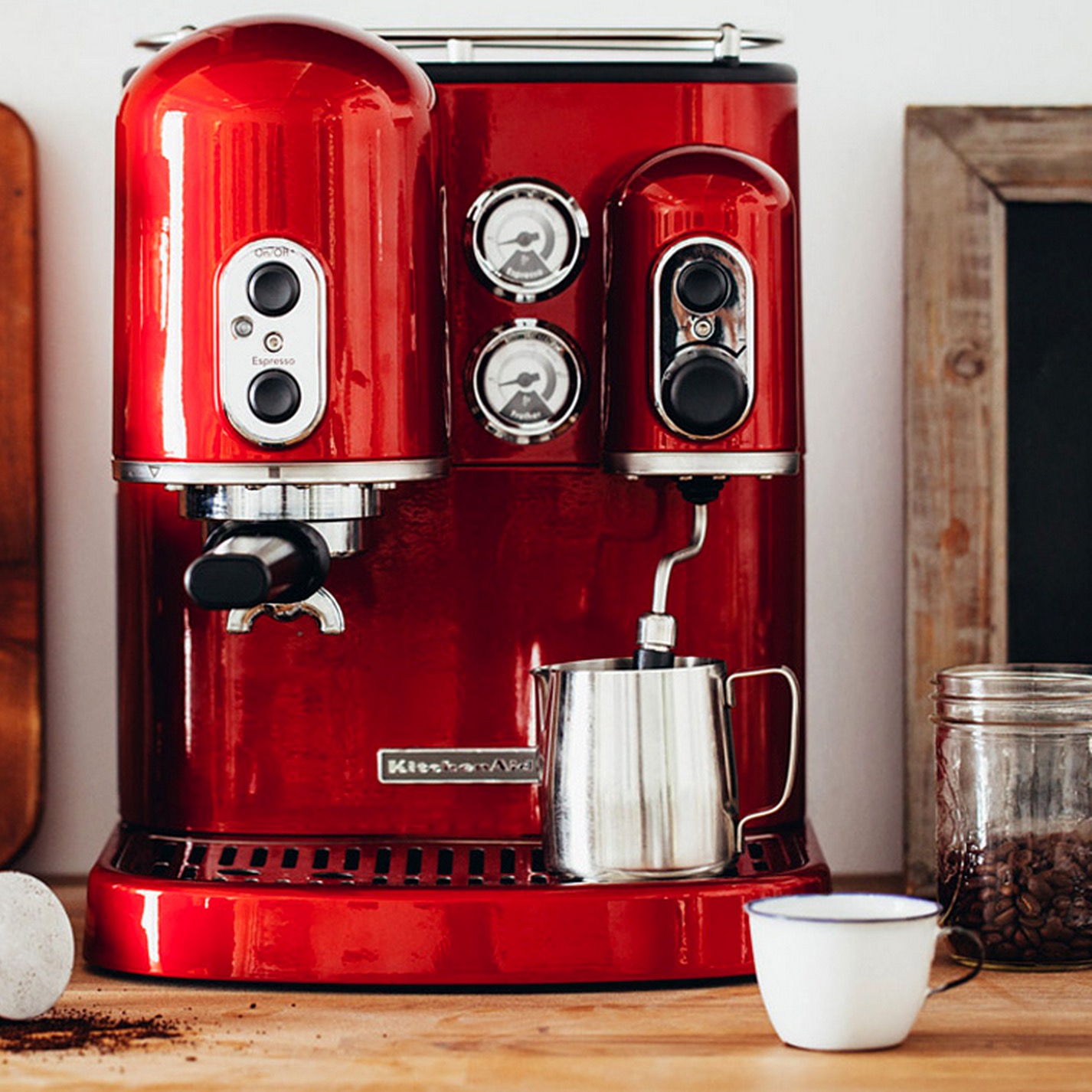 Dit apparaat is niet nieuw, maar willen we natuurlijk wel even vermelden. De klassieke espressomachine van KitchenAid mét melkkannetje. In vier kleuren beschikbaar voor € 599,-.
