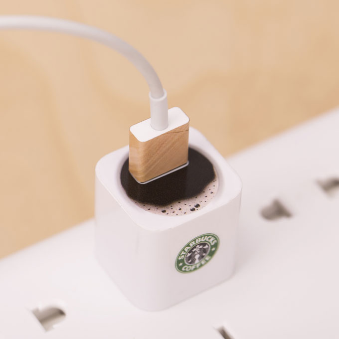 Met dit geweldige opzetstukje lijkt het alsof je oplader van je MacBook in een kopje Starbucks koffie verdwijnt.