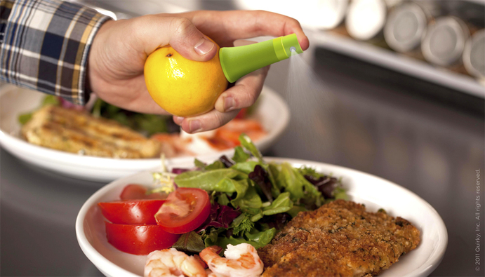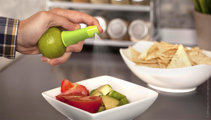 Wat een coole nieuwe gadget: The Stem (van Quirky). Dit hulpstukje duw je in een citroen of limoen, waarna je met het spraydopje het sap er heel makkelijk uit kunt sprayen. Wauw! Dat is een stuk subtielere smaak over bijvoorbeeld je vis, maar ook ideaal over salades of een guacamole.