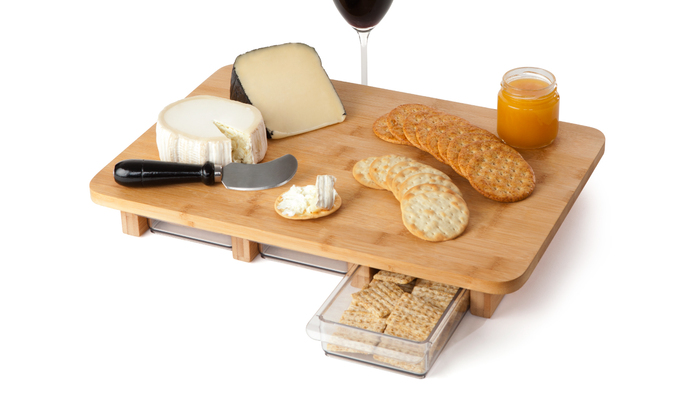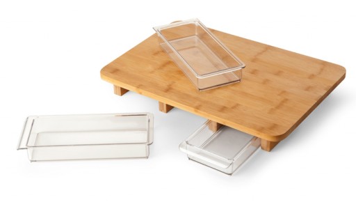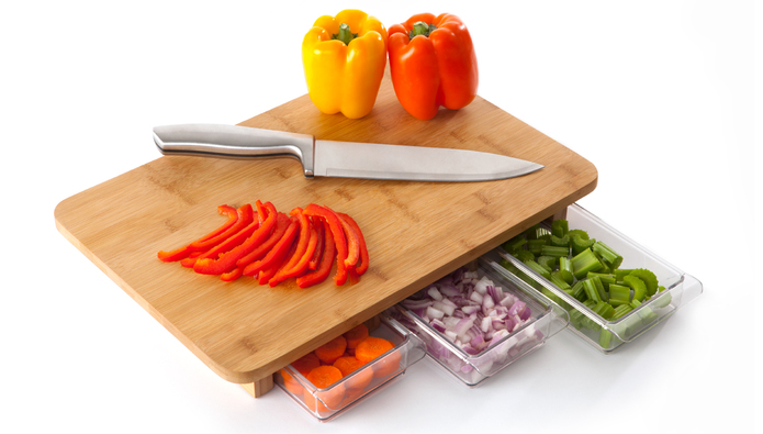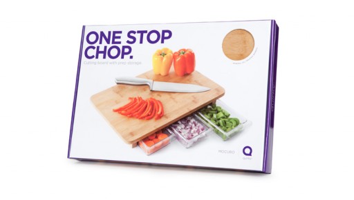 Dit is misschien wel de handigste snijplank ooit. De Mocubo One Stop Chop van Quirky is een bamboe snijplank met 3 handige bakjes eraan vast. Snijd je groenten en schuif ze zo in het bakje, ideaal! Wanneer je klaar bent met snijden haal je de bakjes eruit en leeg je ze boven je pan of schaal, daarnaast zijn de bakjes en de plank ontzettend makkelijk schoon te maken.
