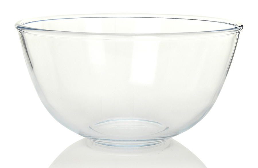 De glazen mengschalen van Pyrex, bekend van de maatbekers, zijn ideaal: want doorzichtig. Een 3-liter kom kost € 12,95. Te koop bij kookwinkels en De Bijenkorf.