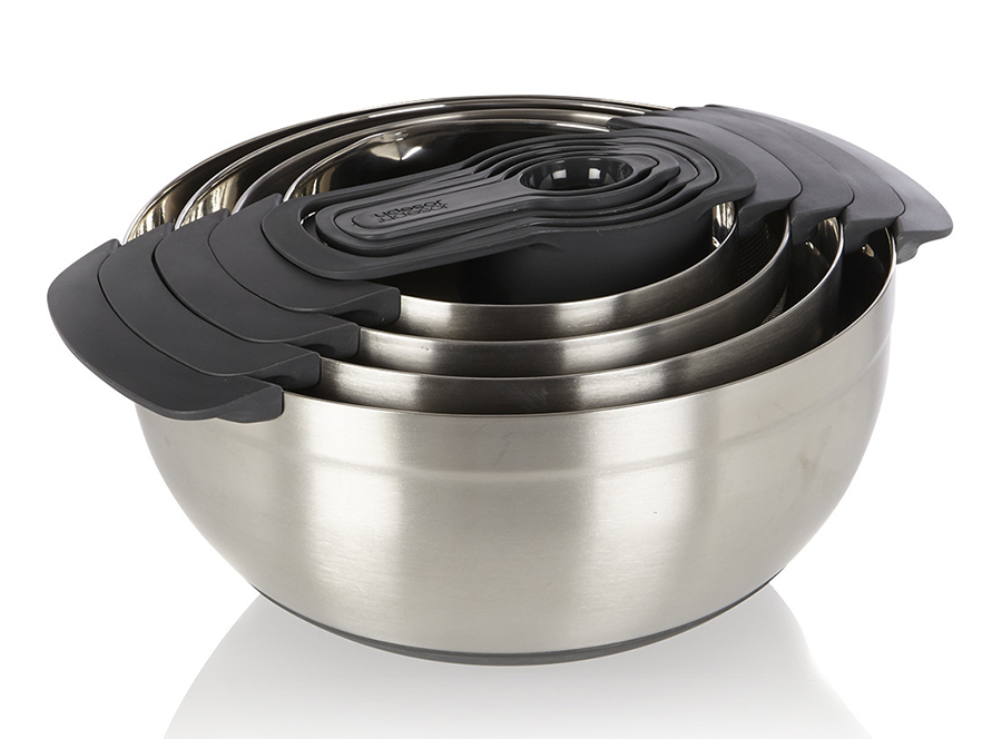 Met deze 9-delige food preparation set van Joseph Joseph (€ 149,95) ben je meteen mooi klaar: mengkommen, vergiet, zeef en maatschepjes in één pakket. Te koop bij kookwinkels en De Bijenkorf.