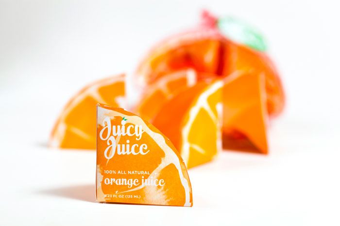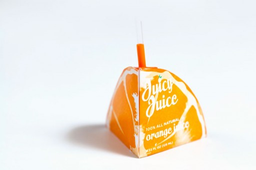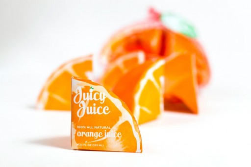 Bedacht door designstudent Preston Grubbs: Juicy Juice. 10 superschattige mini sap-pakjes die samen weer een fruit vormen, zoals een sinaasappel. Wat ons betreft mag dit op de markt komen!