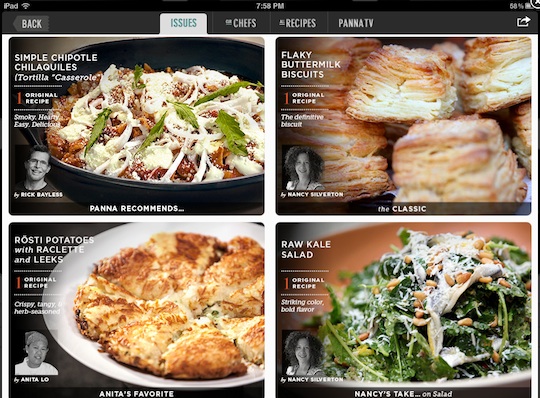 Panna is een kook-app en publiceert elke twee maanden een digitaal magazine en kost $14,99 voor een jaar, daarnaast kan je ook losse nummers kopen voor $4,99. Elk nummer bevat 15 recepten met begeleidende videos, veelal gekookt in de eigen keuken van de chefs en laten stap voor stap zien hoe je het desgewenste gerecht maakt.