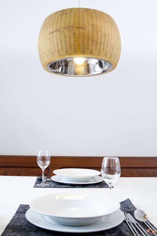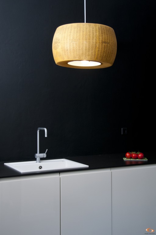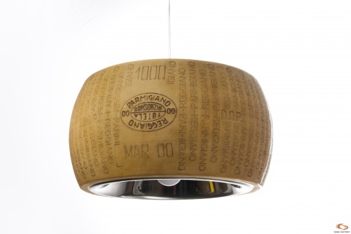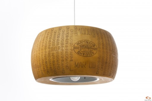 De bijzondere lamp is verkrijgbaar in twee varianten en is een exacte replica van de echte Parmezaanse kazen, ze zijn even groot en hebben zelfs dezelfde details. Beide hebben ze een kap van kunststof en zit het echte verschil aan de binnenkant. We love it!