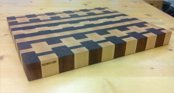 Hij maakt bijvoorbeeld kopshouten snijplanken: planken met aan de bovenkant een dambord van vierkante vlakjes. Een kopshouten plank bestaat niet uit in de lengte verlijmde latten, maar uit korte strookjes zijdelings aan elkaar gelijmd hout waarbij je tegen de jaarringen aankijkt. Wat daar het voordeel van is? Het hout ‘werkt’ in deze opstelling minder; daardoor trekt de plank niet of nauwelijks krom en splijt hij niet op de naden.