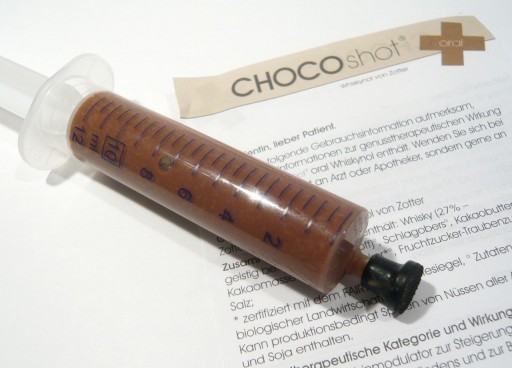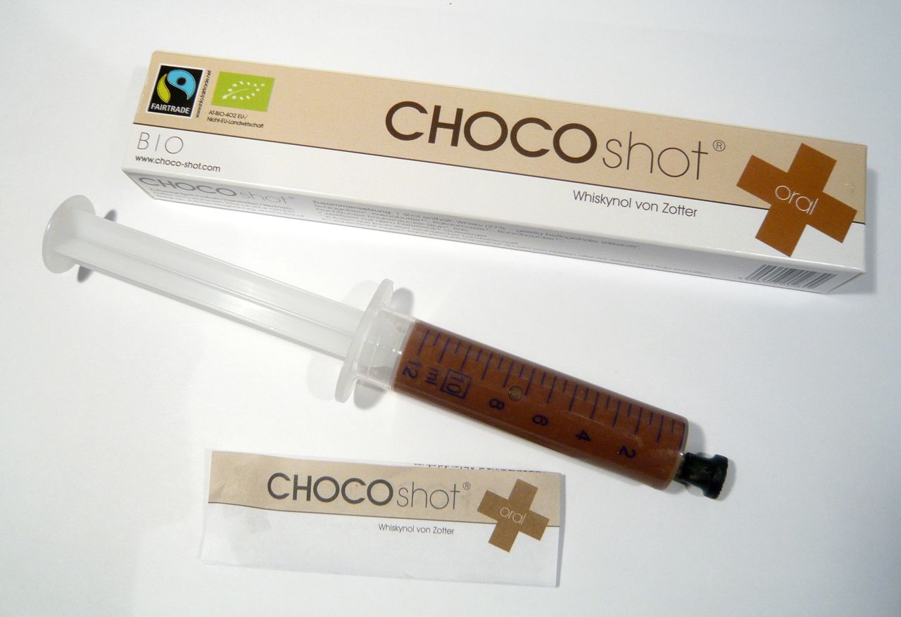 Het Duitse bedrijf Zotter heeft de chocoshot in het leven geroepen. Er zijn meerdere smaken; zoals een shotje met chocolade en amandelen, met koffiesmaak, en whisky flavour. De shots zitten in een injectiespuit van 12 ml, bevat fairtrade chocolade en zijn zo vormgegeven alsof het net een echt medicijn is. Net echt? Chocolade is toch eigenlijk ook een medicijn? ;-)
