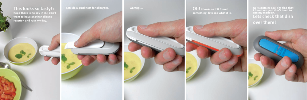 Dit zou wel eens heel goed nieuws kunnen zijn voor culyโs met een voedselallergie. Dit apparaatje, ontworpen door de Zweedse design student Erik Borg, herkent de aanwezigheid van bijvoorbeeld melk, eieren, noten, vis, schaal & schelpdieren, pindaโs, soja of tarwe in een gerecht. En dit zijn toch wel de meest voorkomende voedsel-allergieรซn.