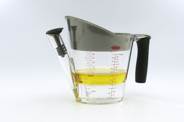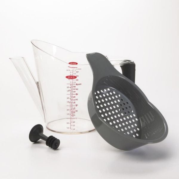 Het nieuwste snufje van OXO is de Vetafscheider. Op het eerste gezicht lijkt het een simpele maatkan, maar het is dรฉ gadget om je bouillons, soepen en sausen vetvrij te maken.